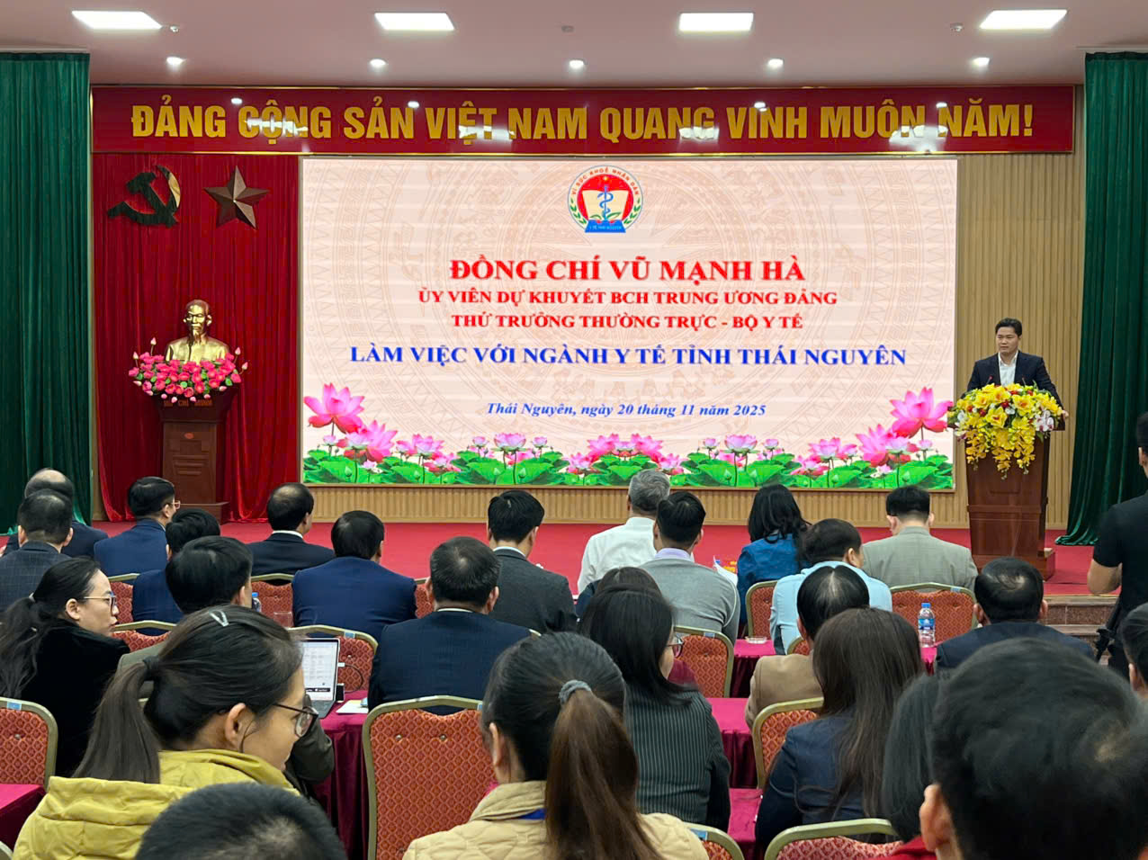 Chiều ngày 20/11/2025, Thứ trưởng thường trực Bộ Y tế Vũ Mạnh Hà đã có buổi thăm và làm việc với ngành Y tế tỉnh Thái Nguyên. Tham dự và chủ trì Hội nghị có đồng chí Trịnh Xuân Trường – Bí thư Tỉnh ủy; cùng dự có đồng chí Nông Quang Nhất – Phó Chủ tịch UBND tỉnh; đồng chí Đặng Ngọc Huy – Giám đốc Sở Y tế, các đồng chí Phó Giám đốc Sở, lãnh đạo các phòng chức năng và đại diện thủ trưởng các đơn vị trực thuộc ngành Y tế.